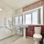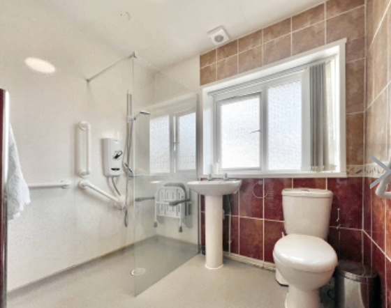uPVC double-glazed frosted window to the rear elevation, accessible shower cubicle with electric shower over, pedestal sink, low level w.c, towel radiator.
