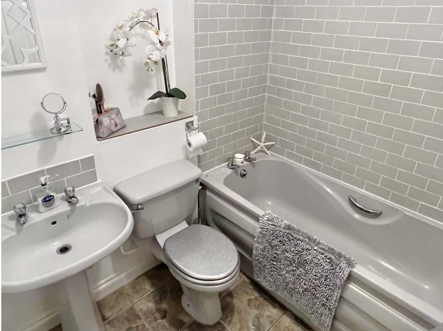 Fitted with a three-piece suite with panelled bath with electric shower over, low level flush w.c. and pedestal sink, radiator.